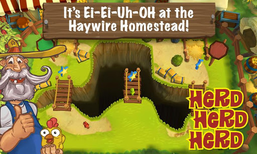 It’s Ei-Ei-Uh-OH! at Farmer Jed’s Haywire Homestead – the animals are makin’ a break for it, so you better wrangle ‘em in quicker than a hiccup! Use all kinds a herdin’ skills to scoot cluckin’ chick’ns, springy sheep and balky bovines back to their pens while avoidin’ coyotes, foxes and chick’n poxes! Things aren’t exactly OK at this corral when the terrain gets tricky; bridges collapse and the fences give you a shock, so be careful herdin’ or yer livestock won’t be live very long!